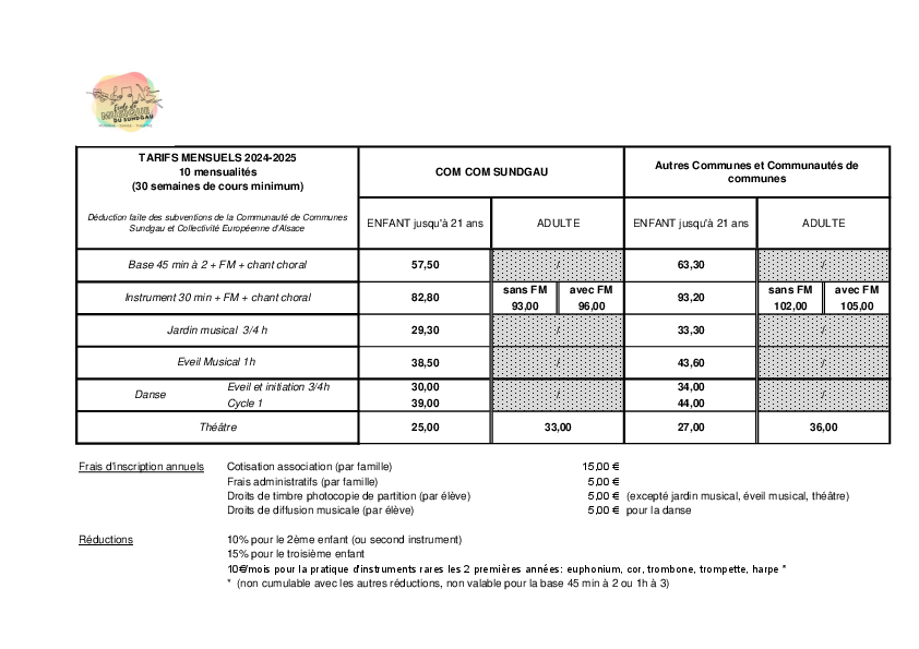 Réductions instruments rares les deux premières années : 10 euros de réduction par mois pour la harpe, les cuivres (cor, trompette, trombone, tuba) et les percussions classiques